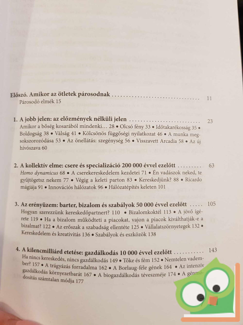 Egyre jobban táplálkozunk, nőnek a jövedelmek, egyre hosszabb a várható élettartam. A betegségek, a gyermekhalandóság és az erőszak is lassan visszaszorulnak az egész földgolyón. Úgy tűnik, Ázsia után Afrika is megindult a nyomorból kivezető úton. A világszerte ismert és elismert szerző, Matt Ridley (magyarul megjelent kötetei Az erény eredete, A sötét bábok királynője és Génjeink) szándékosan provokatív művében nem csupán regisztrálja az emberiség gyarapodásának tényeit. Izgalmas kultúrtörténeti háttért festve magyarázza is a folyamatokat.