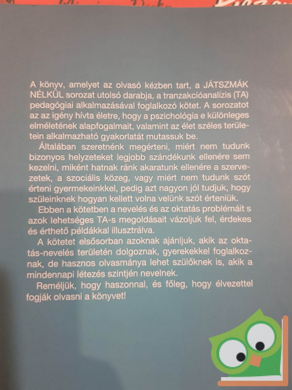 A könyv, amelyet az olvasó kézben tart, a JÁTSZMÁK NÉLKÜL sorozat utolsó darabja, a tranzakcióanalízis (TA) pedagógiai alkalmazásával foglalkozó kötet. A sorozatot az az igény hívta életre, hogy a pszichológia e különleges elméletének alapfogalmait, valamint az élet széles területein alkalmazható gyakorlatát mutassuk be.