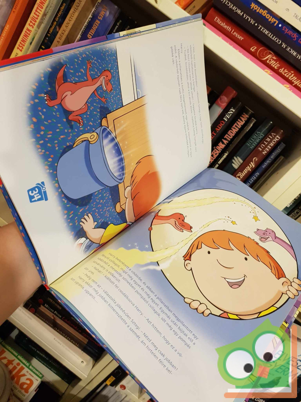 „Egy szép, napsütéses nyári napon történt. Harry, mint minden reggel, most is a konyhában ült, kedvenc dinóbarátai társaságában. Az asztalra ezúttal finom, lekváros csemege került, amit még tökéletesebbé tett a tejszínhabos kakaó, amelyet mamája bögréjéből iszogatott a kisfiú. Ez a gyönyörű bögre volt Harry anyukájának kedvence, és a fiú, ha csak tehette, kölcsönkérte a mamájától. Ebben a bögrében minden olyan finom volt, a tej, a tejeskávé, a kakaó és a tea is!” – Részlet a könyvből