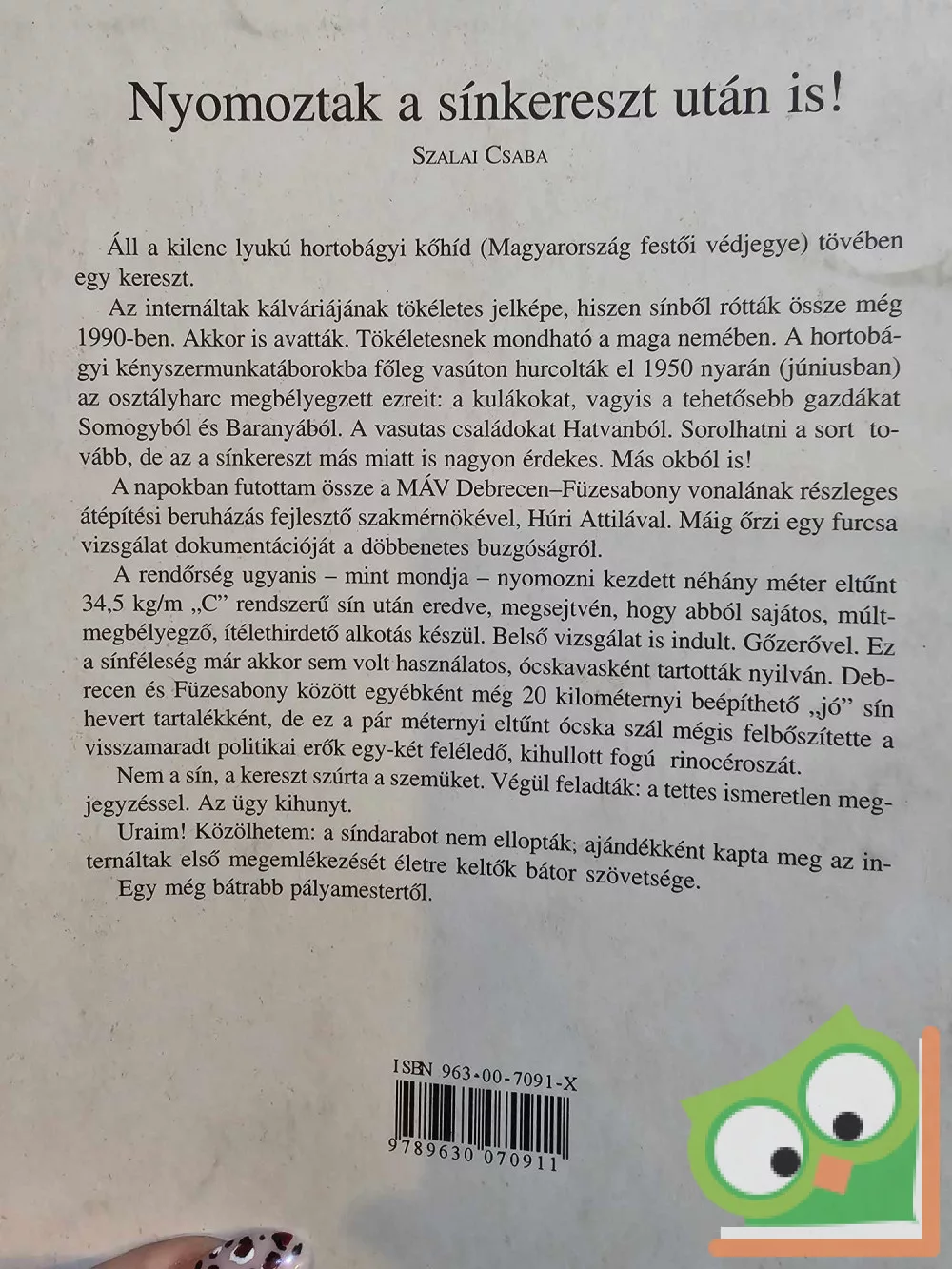 Az internáltak kálváriájának tökéletes jelképe, hiszen sínből rótták össze még 1990-ben. Akkor is avatták. Tökéletesnek mondható a maga nemében. A hortobágyi kényszermunkatáborokba főleg vasúton hurcolták el 1950 nyarán (júniusban) az osztályharc megbélyegzett ezreit: a kulákokat, vagyis a tehetősebb gazdákat Somogyból és Baranyából. A vasutas családokat Hatvanból. Sorolhatni a sort tovább, de az a sínkereszt más miatt is nagyon érdekes. Más okból is!