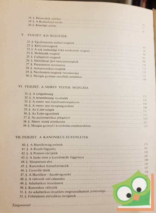 A kötet hét fejezetre oszlik. Ezek: I. Mozgásegyenletek; II. Megmaradási tételek; III. A mozgásegyenletek integrálása; IV. Részecskék ütközése; V. Kis rezgések; VI. A merev testek mozgása; VII. A kanonikus egyenletek.