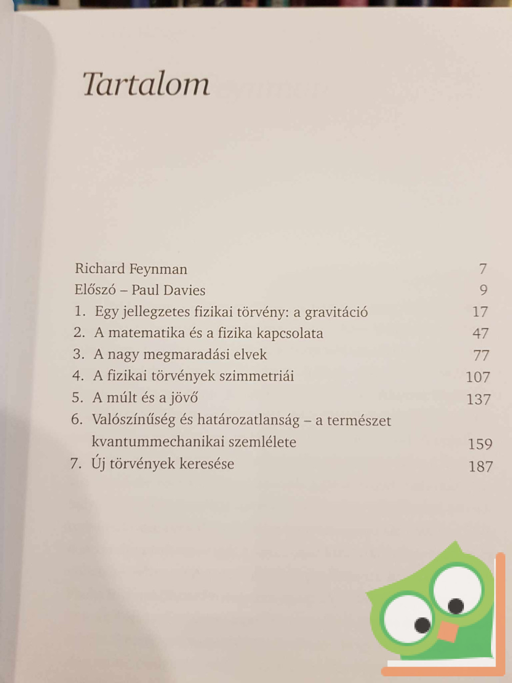 „A természet - írja Feynman - egyszerű, és ezért nagyon szép.” Ám közvetlenül a kísérletekből olvassák-e ki a fizikusok a természet törvényeit? Kiterjesztik-e bátran az eredményeket még feltáratlan területekre, hogy ellenőrizhető jóslatokat tegyenek? Vagy kigondolják törvényeiket, és a valóság nyakába akasztják azokat? Hogy megválaszoljon ilyen alapvető kérdéseket, Feynman professzor felvázolja azokat a témákat, amelyek közösek a gravitáció törvényében és Newton, Maxwell és Einstein nagy, világosságot gyújtó felfedezéseiben. Vizsgálja a matematikát, mint a természet nyelvét, a megmaradás és a szimmetria alapvető elveit, a riasztó tényt, hogy az idő soha nem fordul vissza és a kvantummechanika által bevezetett valószínűségeket és bizonytalanságokat; az utolsó fejezet előretekint új törvények felkutatására. Az eredmény egy gazdag, érthető könyv.