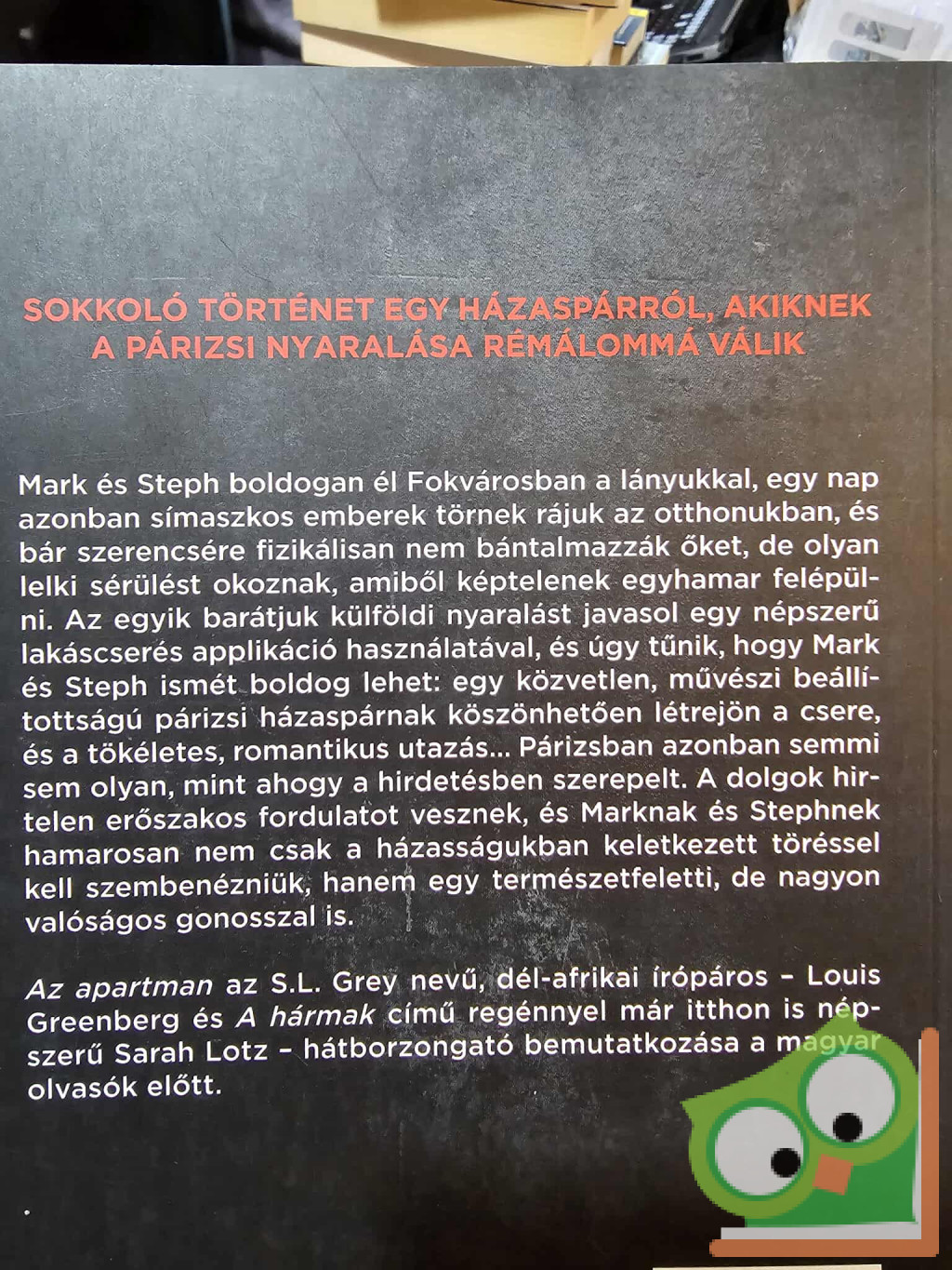 Az apartman az S.L. Grey nevű, dél-afrikai írópáros - Louis Greenberg és A hármak című regénnyel már itthon is népszerű Sarah Lotz - hátborzongató bemutatkozása a magyar olvasók előtt.