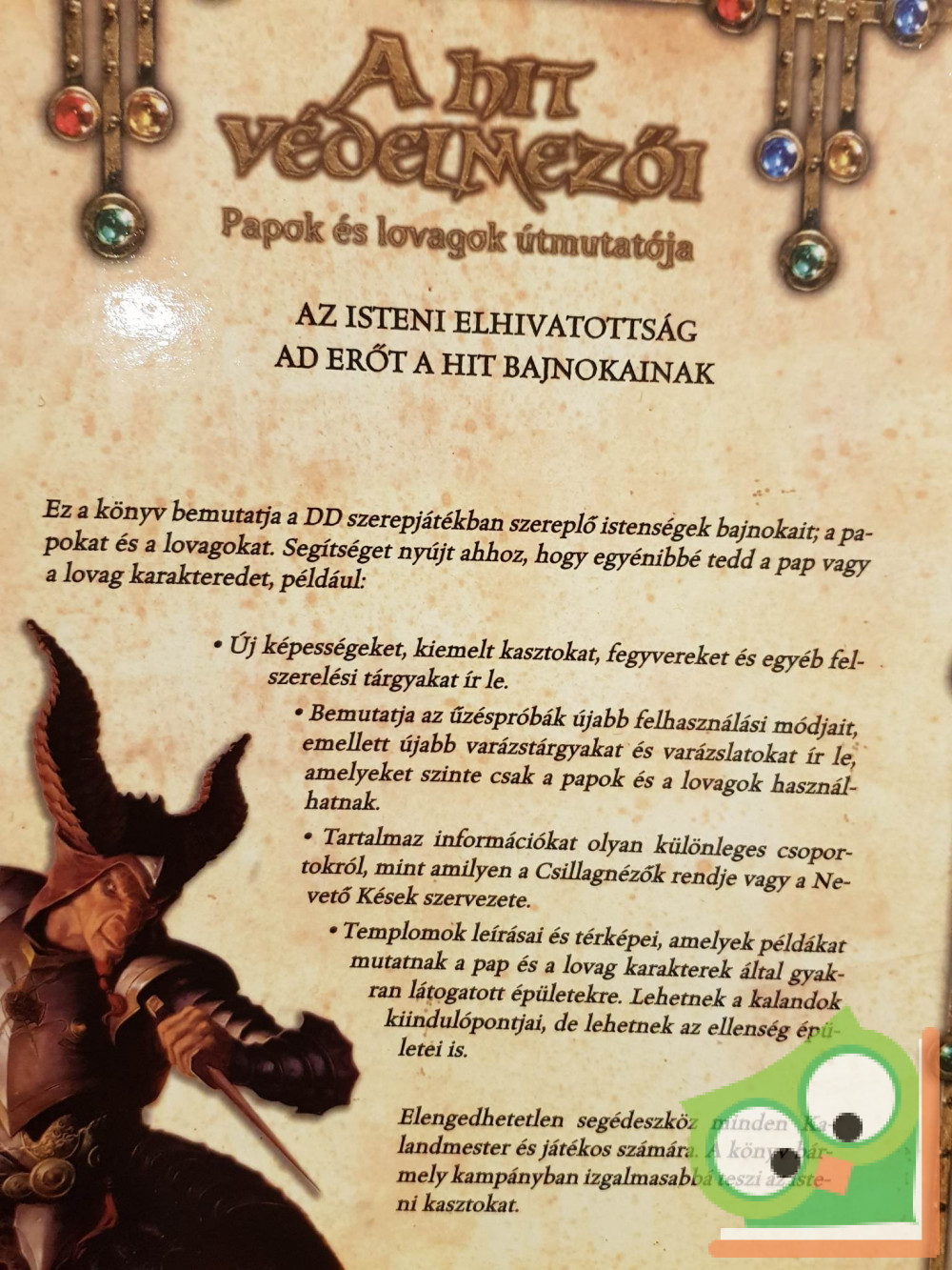 Ez a könyv bemutatja a DD szerepjátékban szereplő istenségek bajnokait; a papokat és a lovagokat. Segítséget nyújt ahhoz, hogy egyénibbé tedd a pap vagy a lovag karakteredet, például: Új képességeket, kiemelt kasztokat, fegyvereket és egyéb felszerelési tárgyakat ír le. Bemutatja az űzéspróbák újabb felhasználási módjait, emellett újabb varázstárgyakat és varázslatokat ír le, amelyeket szinte csak a papok és a lovagok használhatnak. Tartalmaz információkat, olyan különleges csoportokról, mint amilyen a Csillagnézők rendje vagy a Nevető Kések szervezete. Templomok leírásai és térképei, amelyek példákat mutatnak a pap és a lovag karakterek által gyakran látogatott épületekre.