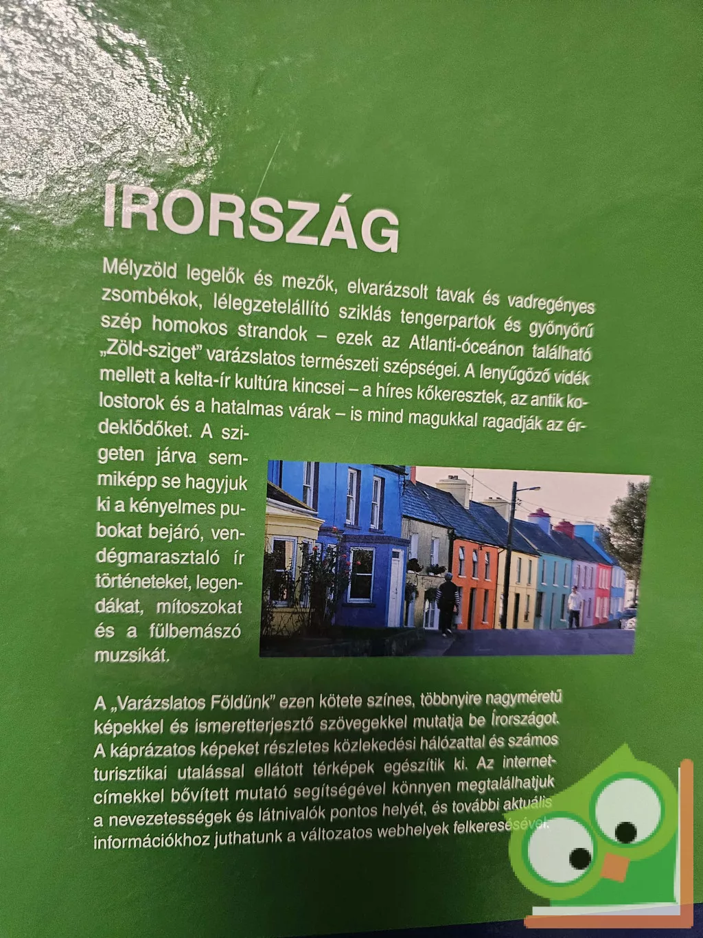 A „Varázslatos Földünk” ezen kötete színes, többnyire nagyméretű képekkel és ismeretterjesztő szövegekkel mutatja be Írországot. A káprázatos képeket részletes közlekedési hálózattal és számos turisztikai utalással ellátott térképek egészítik ki. Az internetcímekkel bővített mutató segítségével könnyen megtalálhatjuk a nevezetességek és látnivalók pontos helyét, és további aktuális információkhoz juthatunk a változatos webhelyek felkeresésével.