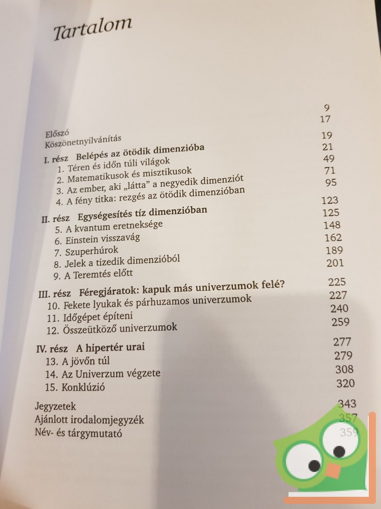 Léteznek-e további dimenziók? Lehetséges-e az időutazás? Meg tudjuk-e változtatni a múltat? Vannak-e átjárók párhuzamos univerzumokba? A tudósok egykor puszta spekulációnak tartották a fenti, valamennyiünket foglalkoztató kérdéseket. Az idők során azonban a helyzet változott: ma már ezek a kérdések állnak az utóbbi idők egyik legpezsgőbb kutatási területének középpontjában. Michio Kaku e könyvben a modern fizika legizgalmasabb (és talán legfurcsább) fejezetébe, a tizedik dimenzió, az időhurkok, a fekete lyukak és a párhuzamos univerzumok világába vezeti be az olvasót.