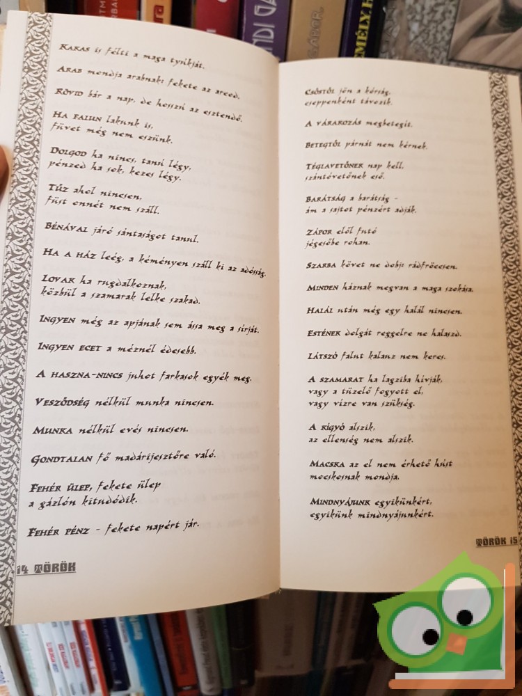 A török nyelvű irodalmak (török, baskír, kazak, kirgiz, ujgur, tuva) és folklór hihetetlenül gazdag anyagából válogatta össze szólásgyűjteményét Buda Ferenc. Ezúttal azonban nemcsak a válogatás tekinthető kiemelkedő teljesítmények, de a műfordítás is. Buda olyan mondásokat, közmondásokat, szólásokat, aforizmákat, bölcs axiómákat gyűjtött össze, amelyek a lehetőséghez képest nem annyira e török népek nemzetközi kötődéseire (motívumvándorlások, átvételek stb.) építenek, hanem a lehető legeredetibb, önálló produktumokra. És ezt a nóvumot, eredetiséget sikerült megérzékítenie a műfordító Budának nyelvi telitalálataival, ősien korszerű fordulataival. – A minden olvasó számára élményszerű újdonságot jelentő gyűjtemény egy hazánkban kevéssé ismert – távoli és ősi – szellemi világba ad kitűnő bevezetést.