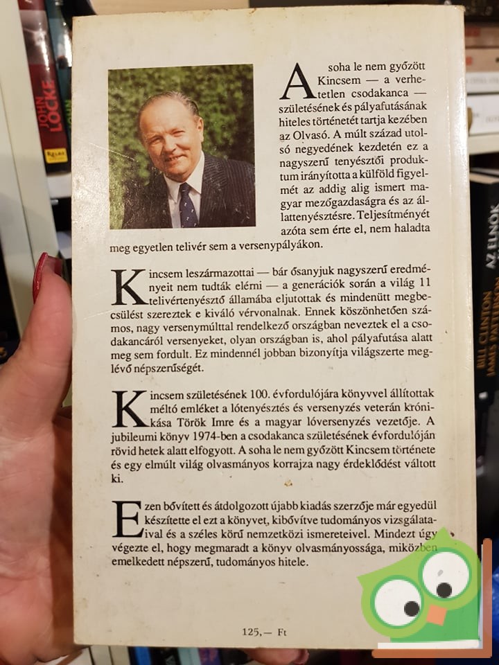A soha le nem győzött Kincsem – a verhetetlen csodakanca – születésének és pályafutásának hiteles történetét tartja kezében az Olvasó. A múlt század utolsó negyedének kezdetén ez a nagyszerű tenyésztői produktum irányította a külföld figyelmét az addig alig ismert magyar mezőgazdaságra és az állattenyésztésre. Teljesítményét azóta sem érte el, nem haladta meg egyetlen telivér sem a versenypályákon.