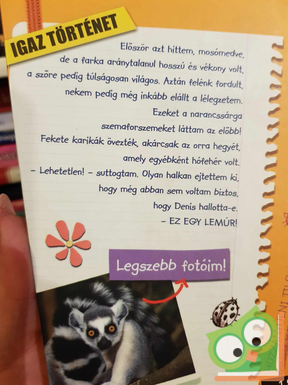 Először azt hittem, mosómedve, de a farka aránytalanul hosszú és vékony volt, a szőre pedig túlságosan világos. Aztán felénk fordult, nekem pedig még inkább elállt a lélegzetem. Ezeket a narancssárga szemaforszemeket láttam az előbb! Fekete karikák övezték, akárcsak az orra hegyét, amely egyébként hófehér volt.