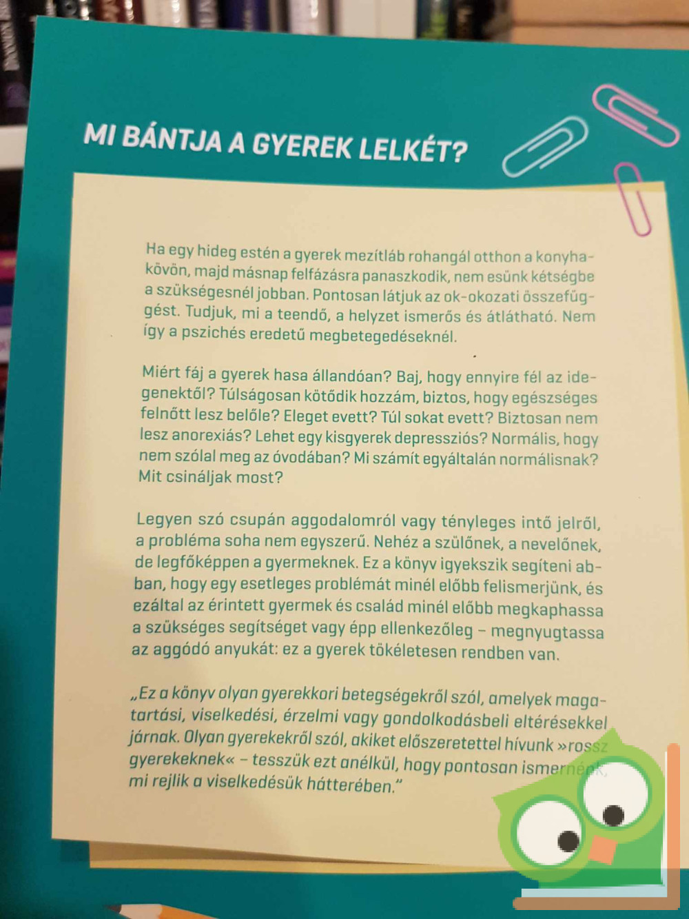 Legyen szó csupán aggodalomról vagy tényleges intő jelről, a probléma soha nem egyszerű. Nehéz a szülőnek, a nevelőnek, de legfőképpen a gyermeknek. Ez a könyv igyekszik segíteni abban, hogy egy esetleges problémát minél előbb felismerjünk, és ezáltal az érintett gyermek és család minél előbb megkaphassa a szükséges segítséget vagy épp ellenkezőleg megnyugtassa az aggódó anyukát: ez a gyerek tökéletesen rendben van.
