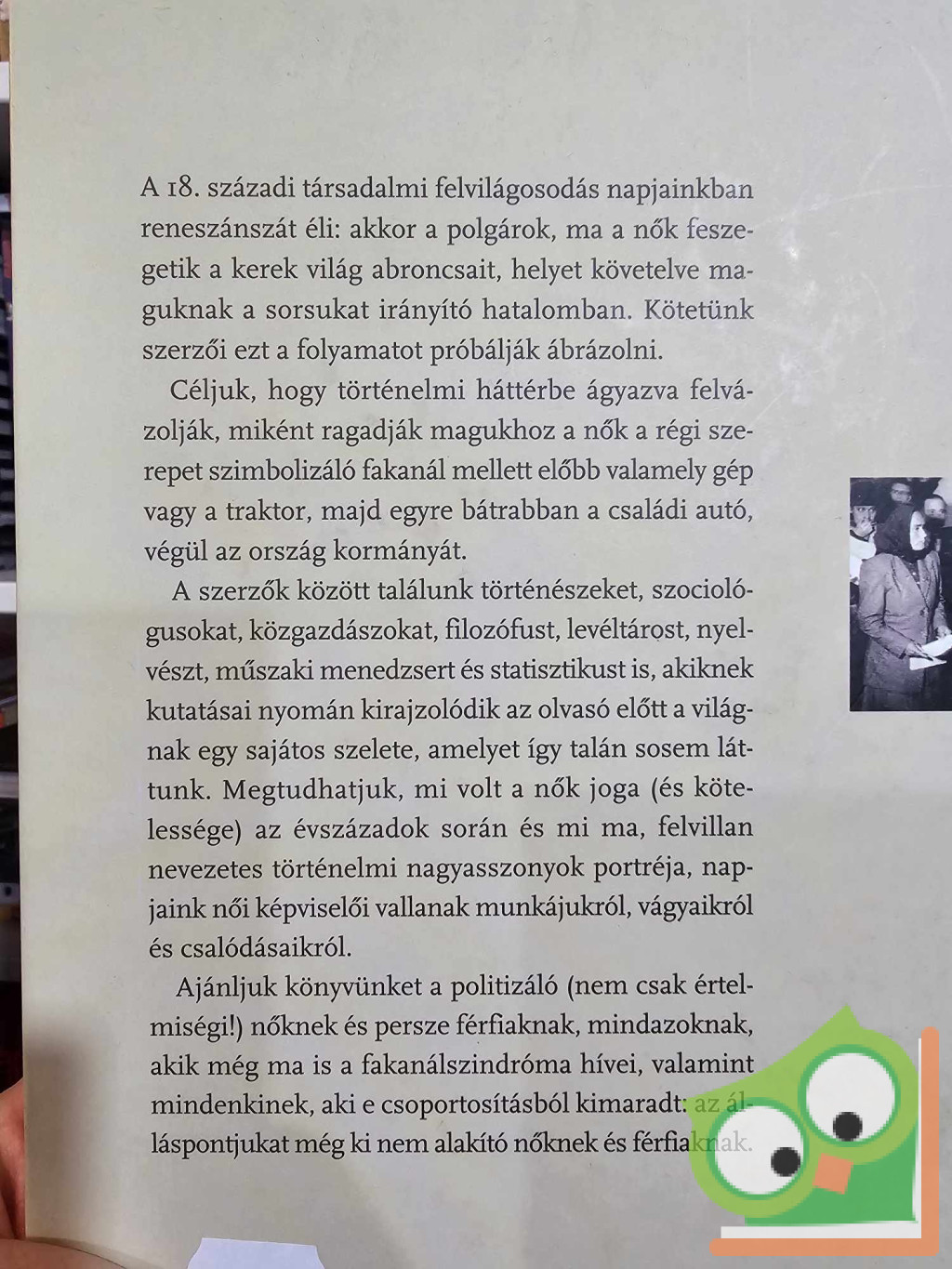 A 18. századi társadalmi felvilágosodás napjainkban reneszánszát éli: akkor a polgárok, ma a nők feszegetik a kerek világ abroncsait, helyet követelve maguknak a sorsunkat irányító hatalomban. Kötetünk szerzői ezt a folyamatot próbálják ábrázolni. Céljuk, hogy történelmi háttérbe ágyazva felvázolják, miként ragadják magukhoz a nők a régi szerepet szimbolizáló fakanál mellett előbb valamely gép vagy a traktor, majd egyre bátrabban a családi autó, végül az ország kormányát.