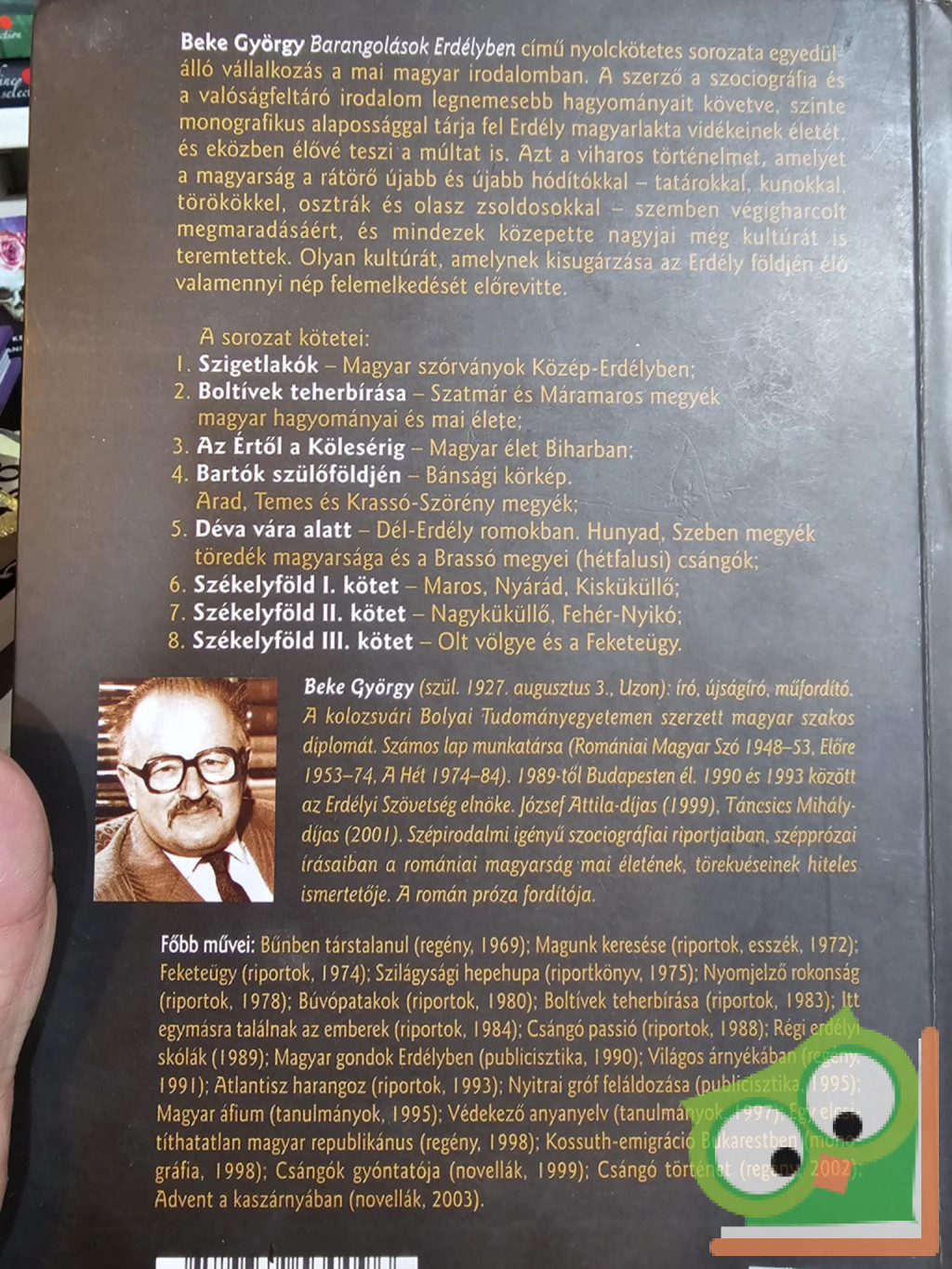 A mai magyar irodalomban egyedülálló, Erdei Ferenc, Illyés Gyula, Veres Péter szociográfiai munkáihoz mérhető vállalkozás Beke György nyolckötetes sorozata. Évtizedekkel ezelőtt nem kisebb célt tűzött maga elé a szerző, mint monografikus alapossággal tárni föl Erdély magyarlakta vidékeinek életét, úgy, hogy közben a régmúlt eseményei is élővé váljanak. A vitákat kiváltó munka a két világháború közötti magyar szociográfia és a kortárs tényirodalom hagyományait követve arra az alapgondolatra épül, hogy a magyar történelem szinte megszakítatlan harc a fennmaradásért a hódítókkal szemben. Ennek a folyamatnak szerves része az erdélyi magyarság küzdelme nemzeti identitásának, kultúrájának megőrzéséért és továbbfejlesztéséért. Az első, majd a második világháborút, illetve a posztkommunista rendszerváltozást követő években is annak lehetünk tanúi, hogy az erdélyi magyarság nagyjai a mindennapos küzdelem mellett a magyar nyelvterületen túlható kultúrát is teremtenek. A hatodik kötet egyik központi témája a 'székely fővárosként' is számon tartott Marosvásárhely. Képet kapunk a város múltjáról, tudományos, művelődési életéről, a ’48-as forradalomban betöltött történelmi szerepéről, az 1950-es években alakult 'Maros Magyar Autonóm Tartomány' körüli politikai vitákról, a hetvenes években titkosan kezdeményezett 'Tiszta Románia' fedőnevet viselő etnikai tisztogatási tervről, illetve az 1990. márciusi vásárhelyi pogrom-kísérletről. A magyar művelődéstörténet, irodalomtörténet olyan nevei tűnnek fel, mint Bolyai János és Bolyai Farkas, a székelység legnagyobb krónikása, Orbán Balázs, a helikoni írótalálkozók mecénása, Kemény János, vagy az utóbbi évtizedekből Antal Árpád, Berde Mária, Sütő András, Szabó T. Attila. A kötetet dokumentum-értékű fényképek egészítik ki.