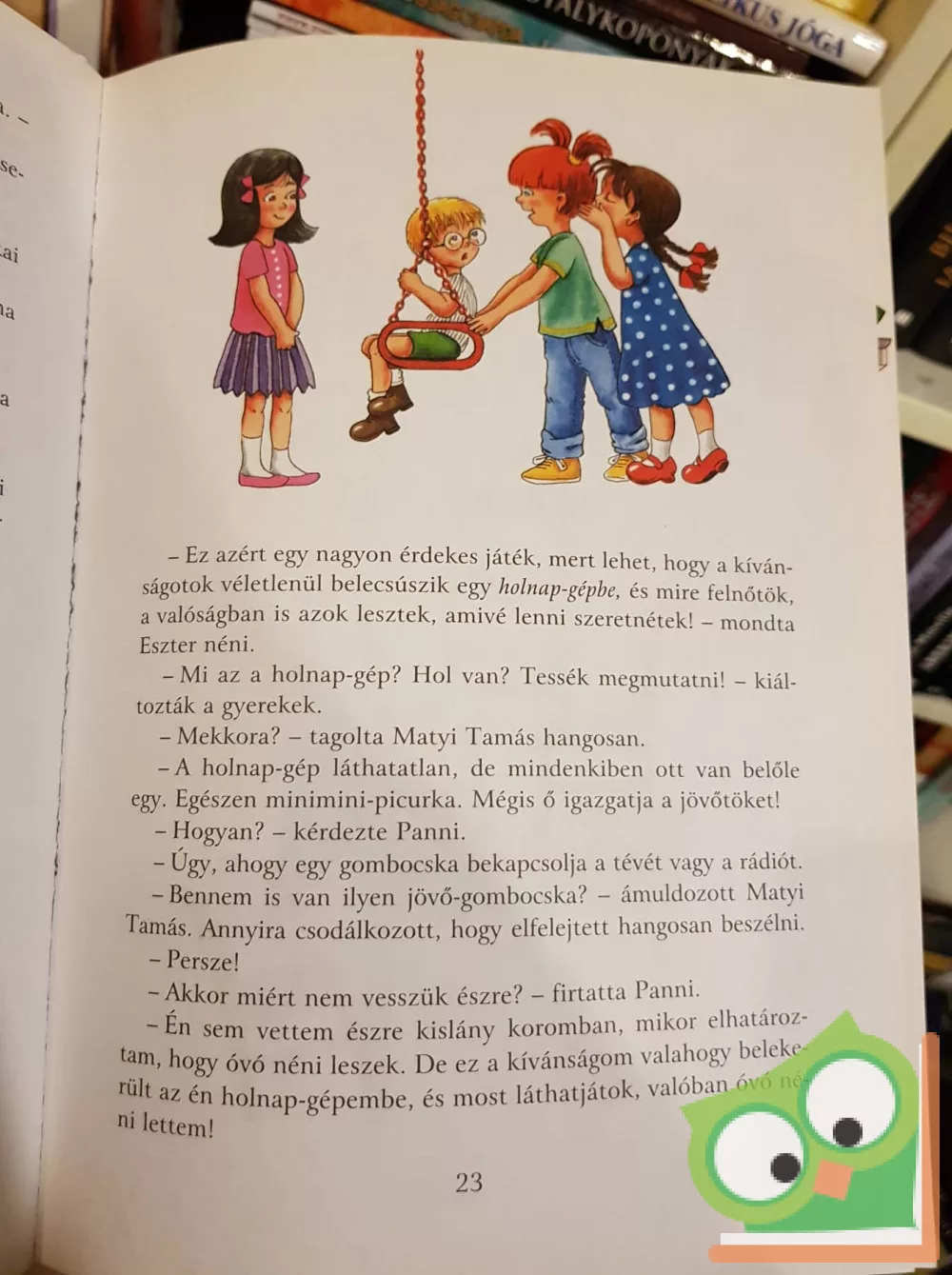 „ – Köszöntél már a világnak ma reggel? – kérdezte nagymama Pöttyös Pannitól. Panni az ablakhoz szaladt, és vidáman kiköszönt rajta a háztetőnek, tévéantennának, ablakoknak, erkélyeknek, virágoknak, a fáknak a kertben, a felhőknek és a napfények: – Szia, világ!”