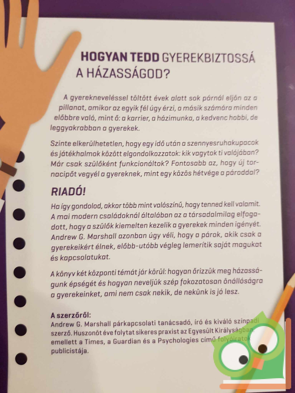 A könyv két központi témát jár körül: hogyan őrizzük meg házasságunk épségét és hogyan neveljük szép fokozatosan önállóságra a gyerekeinket, ami nem csak nekik, de nekünk is jó lesz.
